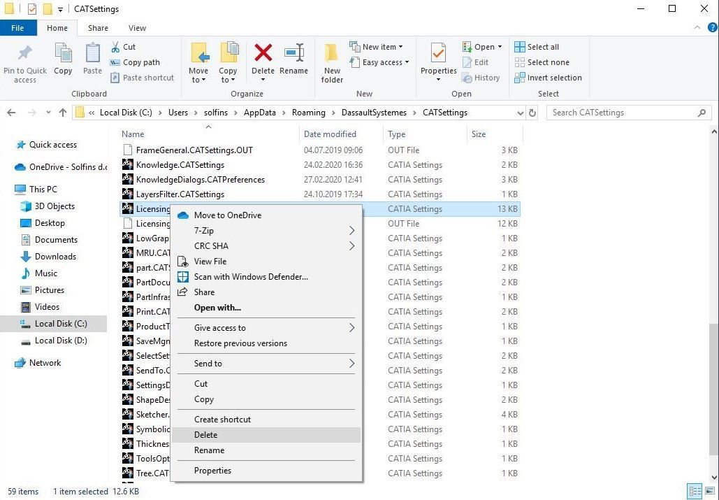 Pre samog započinjanja uninstall-acije potrebno je iz foldera CATSettings do kog vodi putanja Local Disk(C:)->Users->User->AppData->Roaming-DassaultSystemes