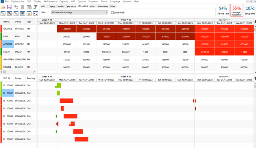 - Various types of link between operations and work orders (min or max lead time, overlap, maximum waiting time, strict synchronization…).