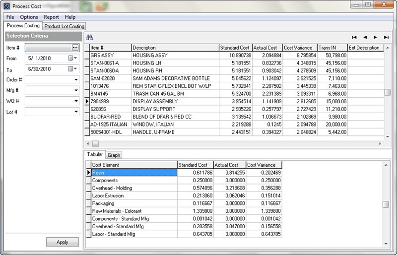 Kada se pokreće kalkulacija standardnih troškova, sistem koristi ove cost elemente, BOM strukture, rute i parametre MFG tipova da za svaki artikal izračuna standard cost i zapamti ga u Item masteru, uz mogućnost da se prate istorijske promene standarda. Kasnije, kada kroz Job & Process Costing uporedimo standardne i stvarne troškove, upravo razdvojenost po cost elementima omogućava da se vidi da li odstupanje dolazi od materijala (skuplja nabavka, veća potrošnja), rada (više sati), mašina (veći mašinski sat ili veće zagušenje) ili overhead-a.