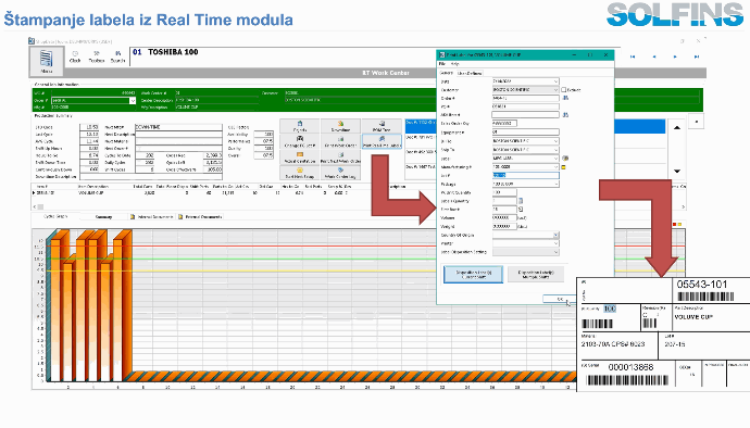 U prijemu, Inventory Control i Item master rade zajedno: ako je artikal označen kao serializovan, sistem zahteva štampu etiketa pri svakom prijemu (preko skenera ili direktno iz EnterpriseIQ), uz opcije za „Prepare for Multiple Labels“ i definisanje koliko etiketa i sa kojim količinama pokrivaju primljenu količinu. U proizvodnji, Floor Disposition (u RealTime, ShopData ili preko skenera) koristi ista pravila – serijski brojevi se biraju za gotove proizvode, backflush komponenti se računa prema BOM‑u, a sve promene po lokacijama i količinama upisuju se u MasterLabel i transakcioni log.