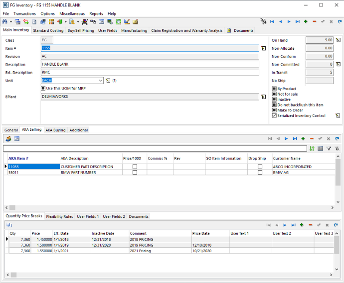 AKA (Also Known As) zapis u DelmiaWorks-u omogućava da za isti fizički artikal koji čuvamo u svom Item masteru vodimo alternativne šifre, opise i pre svega cenovnike po kupcu ili dobavljaču. AKA selling se koristi kada kupac ima sopstveni part number i sopstvene cenovne uslove – u AKA selling tabu se za kombinaciju naš artikal + kupac definišu cene, price break-ovi po količini, valute, datumi važenja, popusti i eventualni specifični rabati ili napomene. Kada se unosi ponuda ili sales order, sistem pri odabiru kupca i artikla prvo proverava da li postoji odgovarajući AKA selling zapis, i ako postoji koristi upravo tu cenu i kupčev part number, čime se eliminiše održavanje posebnih Excel tabela i ručno prepisivanje cena.