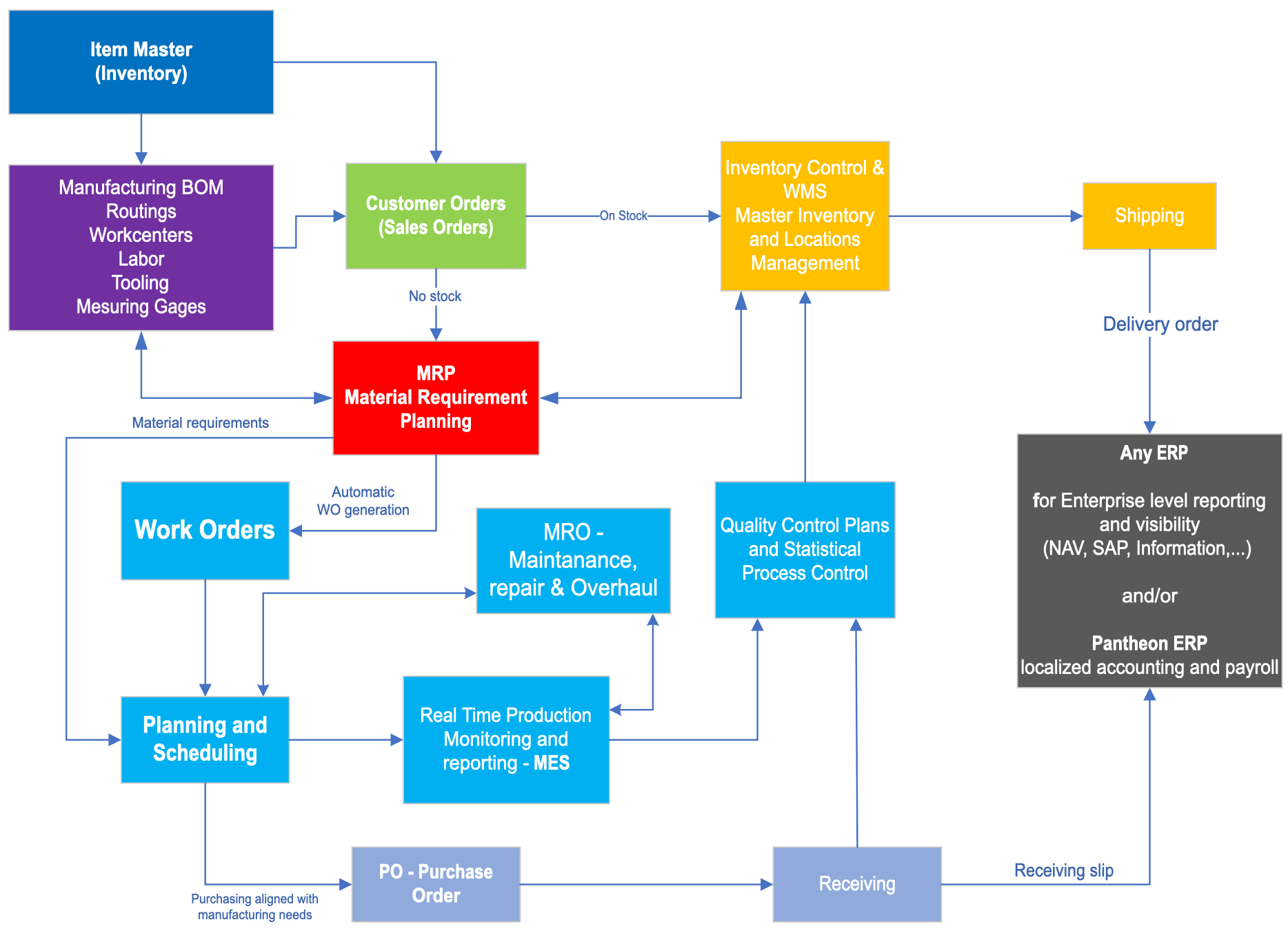 Item master i Inventory Control su povezani sa svim ključnim modulima: BOM i Manufacturing Types koriste Item master kao bazu za strukturu i proizvodni proces, MRP i Planning & Scheduling čitaju iz stanja zaliha i lokacija da bi predložili naloge i nabavke, dok Production Reporting i Job & Process Costing koriste inventarske transakcije za obračun materijalnih troškova i varijansi. Quality Management i SPC vezuju inspekcione planove za artikle, lotove i MasterLabel etikete, a WMS modul proširuje Inventory Control na napredne strategije skladištenja, directed picking, wave picking, interleaving i upravljanje dockovima i kontejnerima.