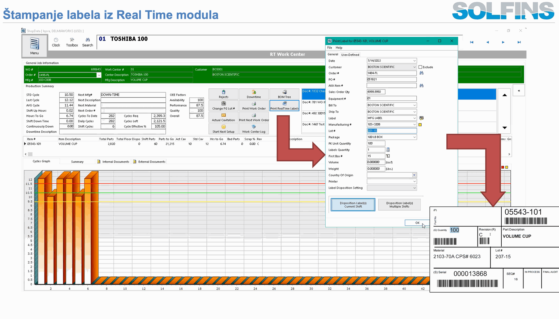 Ključni korak u kontrolisanju proizvodnje je „Floor Disposition“ – trenutak kada se proizvedeni delovi sa radnog naloga formalno prebacuju na zalihe, uz paralelno razduživanje sirovina. U standardnom scenariju, RealTime ciklusi pune proizvodni izveštaj (production report), a Floor Disposition određuje koliko komada ulazi u koju lokaciju, sa kojim lotom i serijskim brojem, uz automatski razduživanje (backflush) sirovina prema BOM‑u i parametrima u Production Reporting modulu. Ako se koristi RT Scan to Inventory, operater praktično samo skenira serijski broj sa etikete, a sistem zna koji radni nalog, koja stavka stoji iza tog serijskog broja i automatski odrađuje transakcije u zalihama.