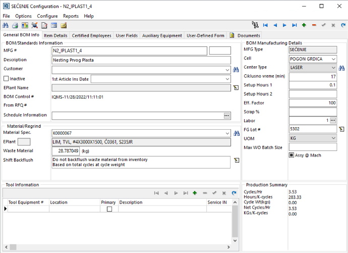 Manufacturing Configuration je, praktično, definicija kako se određeni artikal proizvodi: koji mu je proizvodni tip (Manufacturing Type), koji je BOM (materijali, scrap, potrošnja), koje su operacije (routing), koju vrstu centra (Center Type) zahtevaju i kakvi su cycle time, scrap i rad po operaciji. Kada se generiše Work Order za taj artikal, on povlači baš taj Manufacturing Configuration – zato je kvalitetno podešavanje ove veze „artikl – tehnologija“ ključni korak.