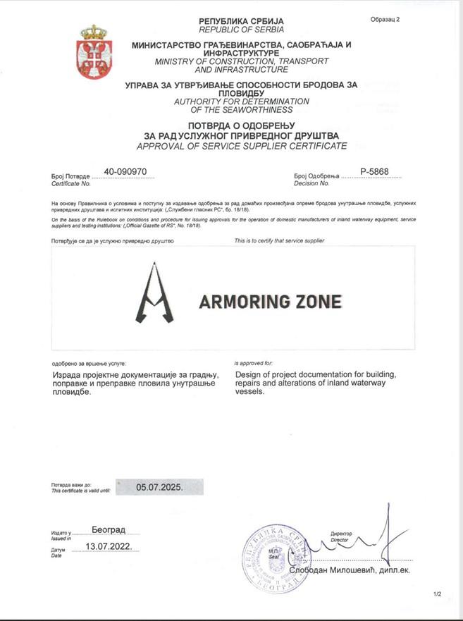 Pored licenciranih inženjera sa licencom 330, kompanija poseduje i ovlašćenje od strane Ministarstva građevinarstva, saobraćaja i infrastrukture za izradu projektne dokumentacije u brodogradnji.
