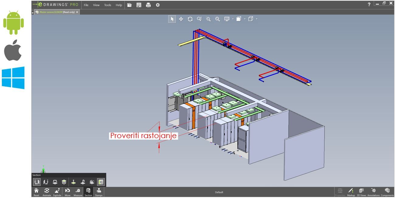 Integrisana funkcionalnost pregleda i prezentovanja 3D modela kompletne server sale u vidu "walkthrough" animacije sa posebnom pažnjom na elemente koje želite da naglasite kao što mogu biti: mašinske instalacije, kolizije, elektro instalacije... Veoma lako generisanje ovog tipa interaktivnog prikaza projekta na osnovu 3D modela.