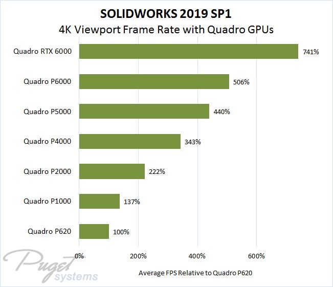 Svetski poznata kompanija Puget systems testirala je performanse nekoliko grafičkih kartica u SolidWorks-u 2019 sa uključenom opcijom Enhanced Graphics Performance i došla do rezultata prikazanih na slikama ispod.