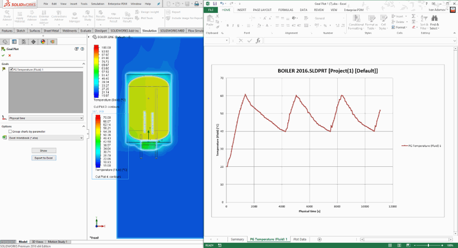 Simulacija procesa grejanja i hlađenja vode u bojlerima. Variranje termoizolacionih materijala, debljina limova, pozicija i oblika grejača. Simulacija takozvane termostat analize, gde se postatra vremenski interval između gašenja grejača i paljenja nakon dostizanja gornje i donje granične temperature. Uticaj pritiska, temperature i strukturnih nosećih elemenata na konstrukciju bojlera.