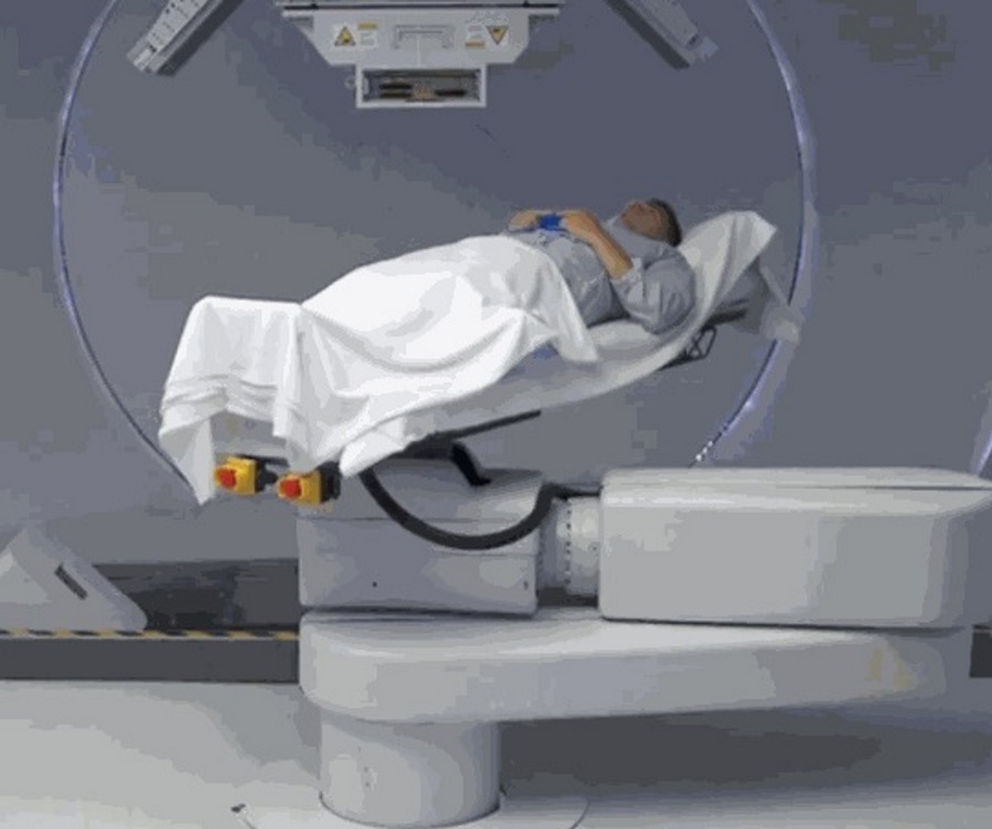 Robotska ruka sa krevetom za pacijenta. Ruka se sinhronizuje sa gornjim protonskim topom koji zapravo vrši tretman pacijenta i uništava kancerogeno tkivo.