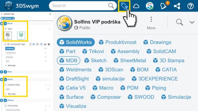 Jednostavno kliknite neki od tagova na vrhu VIP grupe ili ikonicu za tagove pored polja za pretragu u glavnom meniju 3DEXPERIENCE platforme i pretražite tagove: