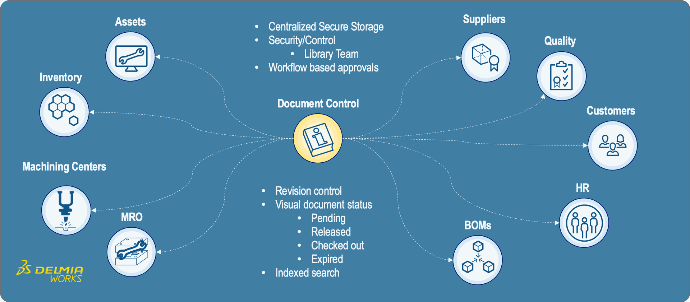 Document Control modul u DelmiaWorks‑u je centralno mjesto za upravljanje svim dokumentima koji imaju veze sa artiklima, BOM‑ovima, radnim nalozima, kvalitetom, kupcima, dobavljačima i projektima, uz punu kontrolu verzija, pristupa, važenja i povezivanja sa procesima u ERP/MES sistemu.