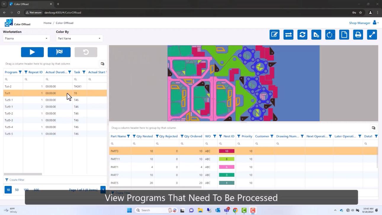 Operateri u pogonu mogu samostalno da unose progres i statuse za svaki radni nalog, krojnu listu ili zapravo program koji se izvršava, a koji ima vezu sa radnim nalozima. Ova aplikacija ne samo da omogućava laku evidenciju, već olakšava i sortiranje i razvrstavanje dijelova nakon izvršenog sječenja, jer omogućava operateru da mu pomoću boja prikaže dijelove koji treba da idu na savijanje, ili dijelove koji pripadaju istom proizvodu, ili istoj porudžbini kupca i slično. U zavisnosti od organizacije firme, operater tada kroz vizuelni prikaz može lako da razvrsta dijelova na prethodno pripremljene palete i da na taj način značajno redukuje prateću logistiku.