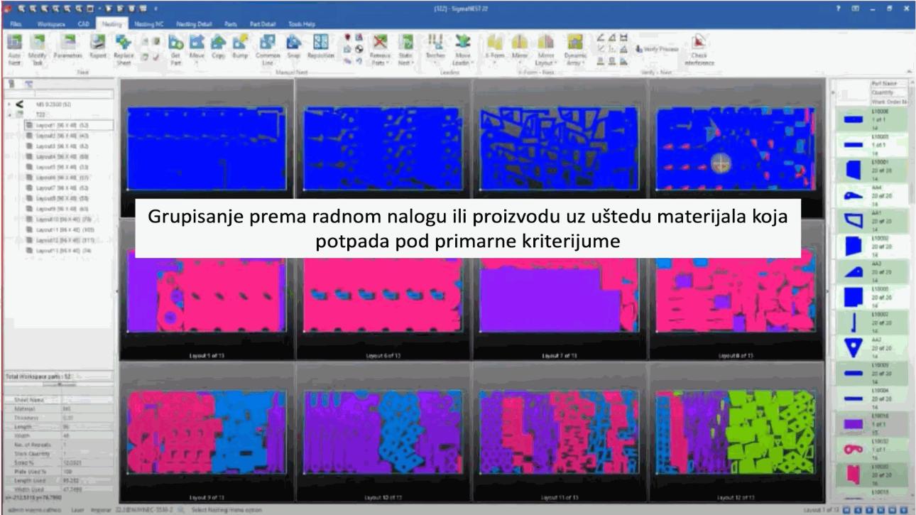 Sam nesting u SigmaNEST-u pored procesa za definisanje tehnologije sječenja, treba shvatiti i kao početni korak u planiranju proizvodnje. Softver na nivou radnog naloga ima informacije o roku isporuke, o narednim operacijama, kroz koje dijelovi prolaze, ima informaciju o materijalu, debljini lima, prioritetu. Kombinovanjem tih informacija softver dozvoljava kombinovanje radnih naloga u okviru istog nestinga ili table materijala!