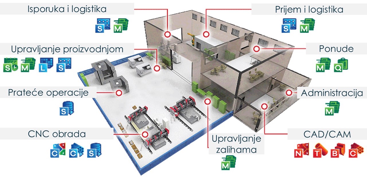 Sečenje limova i ostalih pločastih materijala sa najmoćnijim nesting podsistemom na tržištu, lasersko sečenje cevi, profila i šipki sa prostornim tru-shape nestingom, savijanje lima sa automatskim kreiranjem tehnologije, sečenje cevi, profila i šipki na testeri sa prostornim tru-shape nestingom, podrškom za buntove i generisanjem izveštaja i NC kodova. Sva rešenja imaju aplikacije za operatere u pogonu, vezu sa samim mašinama, mogućnost praćenja zaliha i integraciju sa vašim ili našim ERP softverima.